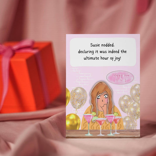 Funny Birthday Card - Comic Happy Hour Design - Cocktail Themed Card for Her - Humorous Birthday Card for Friends & family Celebration Card