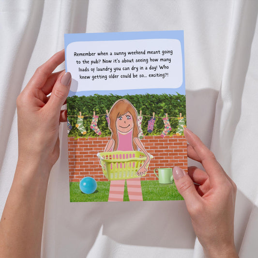 Hilarious Birthday Card - Comic Beer Garden & Laundry Illustration - Funny Banter Card for Him, Her, Friends - Humorous Birthday Greeting