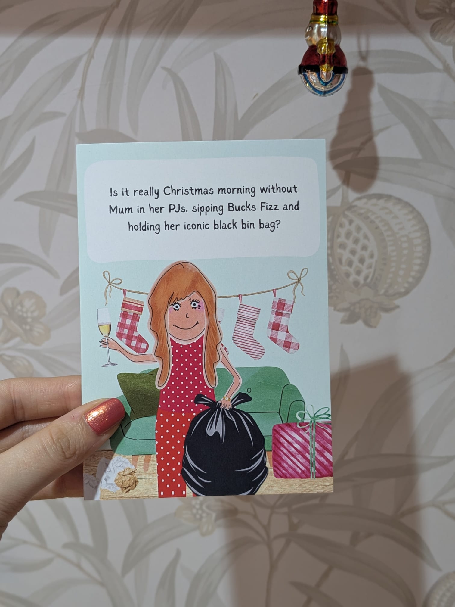 Hilarious Christmas card for Mum featuring the reality of Christmas morning bin bag duties. Perfect funny Xmas gift for mums who do it all. Premium A6 greeting card with envelope. UK family business.